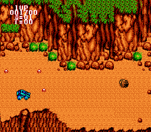 Breakthru would be a rip-roarin’ good time, if it weren’t for the crappy controls. Instead of pressing “A” to accelerate, like every other NES racing game ever, you push right on the “D” pad. This frees up the “A” and the “B” button to be “jump” and “shoot” respectively. A seemingly wise decision, until you realize that going fast is tantamount to instant death, and slowing down is tantamount to a slower death that you can easily see coming, so you’re free to shout “NOOOOO!!!!!” as your truck explodes. I’m going to paint a picture of the first level: you’re driving fast, shooting stuff, dodging out of the way of trucks and what-have-you, when suddenly, a rainstorm of boulders falls on you and you die. Alright, take it slower. You do this, shoot up the boulders after they fall, and they can’t hurt you. Perfect, until you run into an avalanche of rocks that you can only jump over when you’re going fast. So after experimenting and finding what I believed to be the perfect mix of precision, speed, and awesome, I propelled my truck forward past the falling boulders, past the rock avalanches (two separate things, trust), and finally, two large missiles came out of the sky and made me explode. And yes, after trying to get past the missiles repeatedly, I cursed the number one-hundred with all my might.