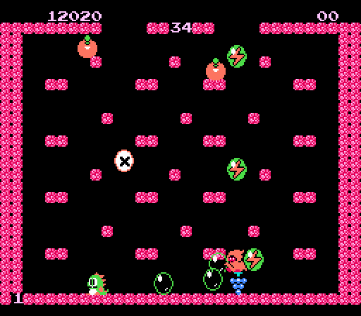 For me and mine, I could only bobble my way through twenty levels. Yes, the levels grew harder as I went on, but I didn’t stop due to difficulty; the game features a handy-dandy continue option and password system, which is definitely necessary if you want to go deeper into the abyss. I just grew bored by putting enemies into bubbles level after level. It’s true, the level and enemy designs were cute (some level designs even allude to old Taito games, like Space Invaders) but it wasn’t enough to make me want to continue playing. Had I another person, I believe the game would have been a lot more fun. The levels are just big enough and include just enough enemies, that throwing another dinosaur into the mix would be chaotic fun – especially since you can bubble your teammate.