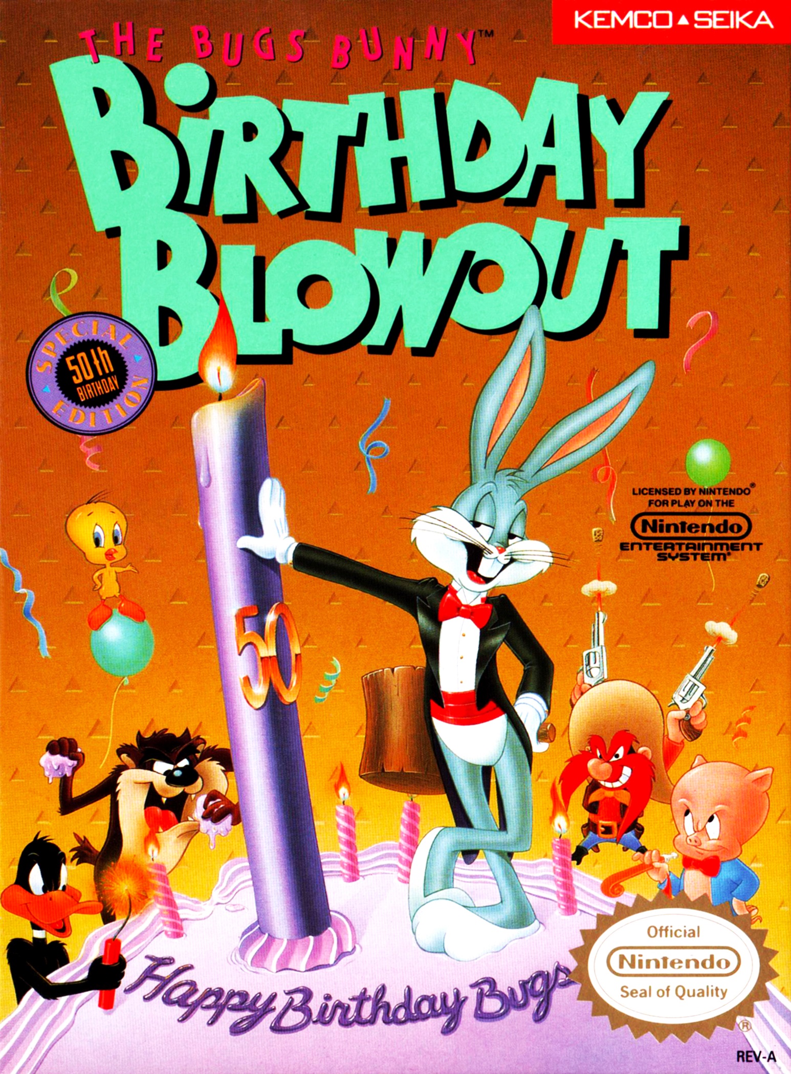 In one of the greater stories told on the NES, Bugs Bunny’s Birthday Blowout – or Bx4, as it will be called henceforth – has Bugs attempting to reach his fiftieth birthday ceremony thrown by some of his biggest fans. Unfortunately, all of his fellow Looney Tunes feel neglected, hurt, and angry that they weren’t invited and are attempting to sabotage Bugs on his way to the party. One would think this would involve traps, guns, bombs, rockets, and other well-laid plans, but no. It involves exploding alarm clocks, walking mallets, juice boxes, among other strangely designed enemies; Kemco was going for a more avant-garde Looney Tunes game, apparently. The enemies, while obscure and confusing, don’t do much to hurt you. It’s usually by mistake when Bugs gets hit. The bosses are, of course, the other Looney Tunes, but their attempts to stop Bugs are poor at best. Why does Tweety think that throwing a tomato at Bugs will stop him dead in his path? Bugs has a mallet and Tweety is a dumpy little bird, easily squashed by mallets and other blunt instruments. All this to say, this game is incredibly easy.