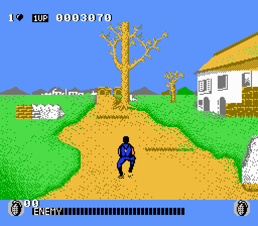 What makes the game different than, say, Contra, is the perspective. Instead of a side-scroller, you’re attacking the enemy from a third-person perspective. In other words, your protagonist is in the foreground, and the enemies come to do damage from the background. It’s a cool idea, but it isn’t executed well. The enemies come at you like you’re Arnold, Sly, and Van Damme combined, and all you have to hide from their onslaught of bullets and Molotov cocktails is a piddly little wall. The wall breaks down over time, and eventually, you’re in the fray without any place to hide. The first couple levels aren’t so bad, but the game ramps up the difficulty quicker than you can say “snot rocket.” It also doesn’t help that your shooting cursor is always a couple steps behind you. You control your guy’s movement with the D-pad, but you also control the cursor this way, and as a result, the cursor lags which can result in abundant deaths and frustration for you. The enemy bar at the bottom of the screen is the only way you know if you’re doing damage. Obviously, the bigger enemies you destroy – tanks, helicopters, buildings, etc – the more life you take off.