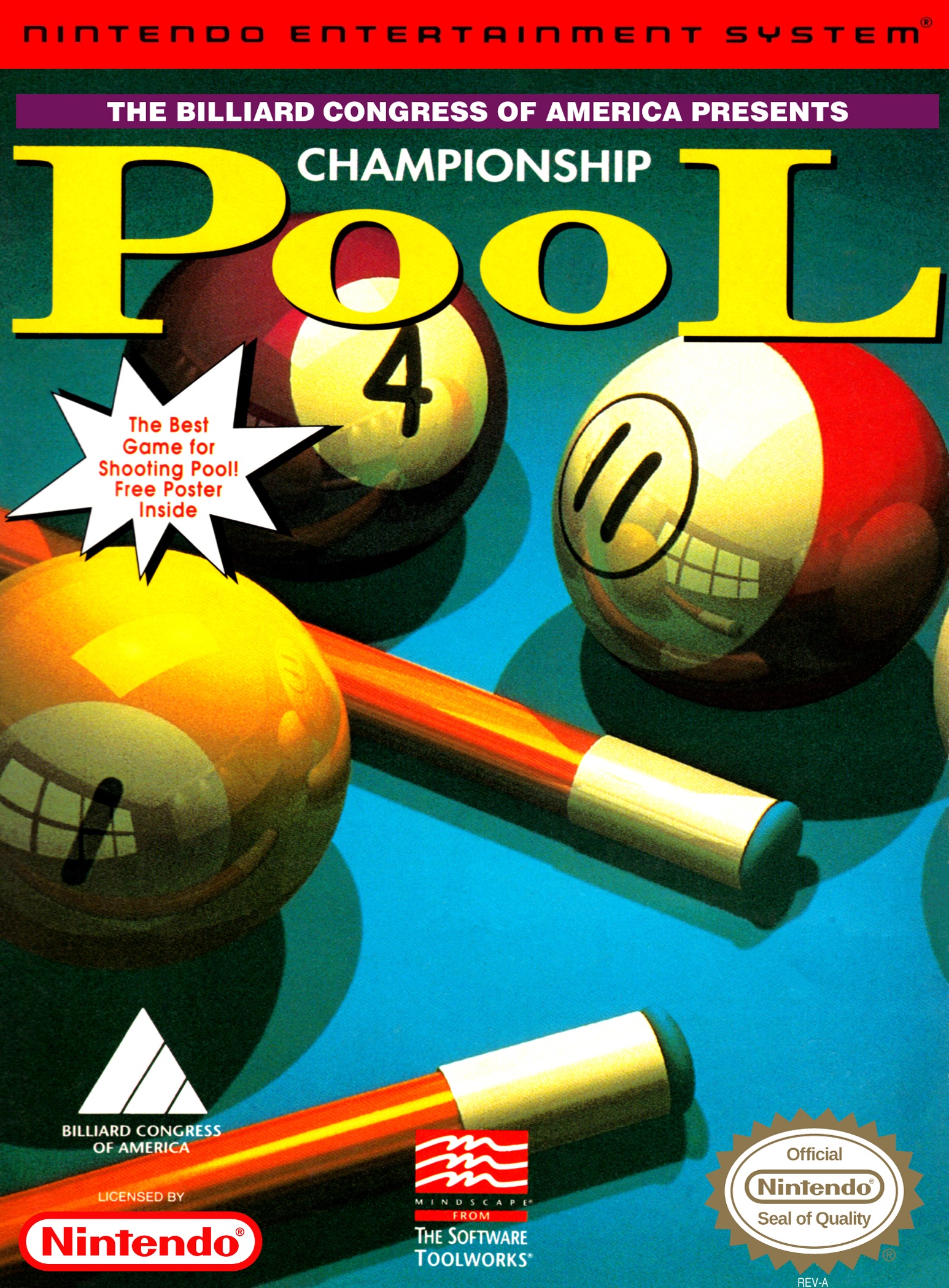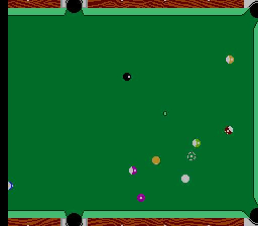 Aside from the music, Championship Pool is a decent, time-waster of a game; one that you pick up from a pawn shop for a dollar and play for an hour with a couple buddies before setting it back into your NES collection. It has all the typical modes a pool game should: tournament, challenge (a simple three-round game), party (for all the party people with multitaps, holla), and freestyle (a no-holds-barred anarchist take on pool). In the challenge mode, you can choose from the varying types of pool games, like 8-ball, 9-ball, 14.1 Continuous, etc. What makes Championship Pool stand apart from all the Side Pockets and Breaktimes out there is the aiming system. If you drag your cursor to the ball you want to hit and press “A” once, it will show you the direction the ball will go if you choose to hit it there. Move the cursor gently around the ball and the direction’s movement will change. Move the cursor to a different ball and it will do the same thing. It’s a really unique feature that, surprisingly, doesn’t make the game easier, but it certainly helps you make the best shots available.