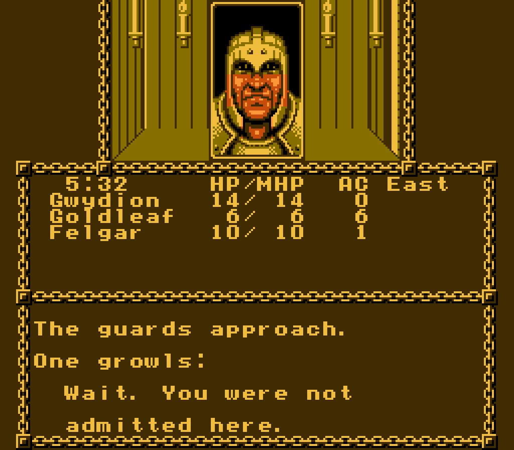 Pool of Radiance begins similarly to Hillsfar. Make a character, choose a class, race, etc. You’re then ushered into the city of Phlan by a tour guide. The city itself resembles a poorly-made Wolfenstein 3D level where everything looks the same. The guide is trying to tell me where the city council is, where the three temples are, where the “back streets” are, yet every stinking door looks like the one that preceded it. It doesn’t help that Pool of Radiance‘s color palette range of stark gray and poop brown, painting everything that dull flavor that Nintendo D&D games are known for. Once my tour guide left me, I wandered around for awhile trying to figure out where to go before I just completely stopped. If a game is going to make itself incredibly difficult to even accomplish one’s first task, it’s not worth it. Can you imagine what the fools who made a FAQ for this over at GameFAQS had to go through? It would take a lot of mind manipulation to make yourself believe this game was even worth playing, let alone writing (or reading) a long, tedious FAQ about it.