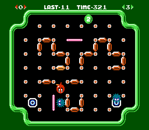 Clu Clu Land‘s gameplay distinguishes itself from the other early game releases of the day by being so downright strange. If I had to pigeonhole it into a genre, I’d say it’s an action-puzzler, but it really is just its own game. Each stage has a series of pivots that you, a fish/lobster hybrid must navigate through and grab onto. Some pivots hide golden coins that can only be revealed by swinging around them; the amount of coins in each level is shown at the top of the screen. Once all of the coins are exposed, they form to make a picture and the level is complete. While you try and expose the coins, green blowfish and whirlpools try and stop you. There are also pink bouncy barriers that pop up every now and then – while not directly an enemy, the barriers do a good job of thrusting you places you don’t want to go. There’s also a time limit for extra flavor and difficulty.