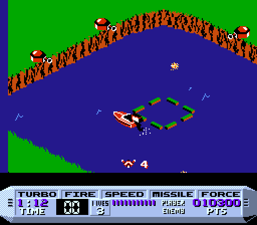 I was really hoping Cobra Triangle would be the sequel to Cobra Command seeing as, you know, they both have the word COBRA in the title. Alas, it’s yet another Rare NES game destined for the bargain bin of history. To digress for a moment, Rare is such a strange, on-again, off-again company. Before they made Donkey Kong Country, they developed almost forty games for the NES in four years. That kind of output is insane! As a result of such quick development time, many of the games produced during this era are, at best, average. After Donkey Kong Country sold six billion copies, though, they became Nintendo’s right-hand company. Everything they made for Nintendo seemed to turn to gold, until Starfox Adventures came along and Nintendo said, “You know what? Rare effectively killed Starfox, kthxbai” and ended their partnership. Microsoft came along and purchased them in 2003, thinking they made a wise move. Kameo, Grabbed by the Ghoulies, Banjo and Kazooie: Nuts and Bolts, and Perfect Dark Zero have been the fruits of the Rare/Microsoft relationship; that’s a large $375 million woops on Microsoft’s part. It’s only with a couple recent Kinect games that Rare has started to turn a profit for Microsoft. None of this has to do with Cobra Triangle, a bizarre RC Pro Am-inspired series of boating challenges that range from “playable” to “so long, folks.” I just felt like recapping Rare’s history because, well, this is my blog and I needed an intro paragraph.