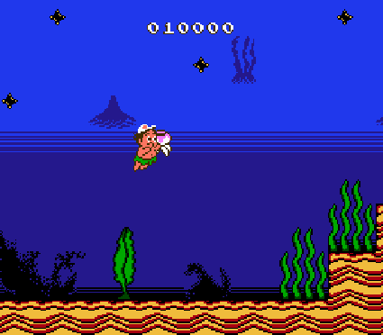 When you first fire up the game, Hudson Soft’s changes seem like they’re for the best. Higgins’ sprite size is smaller and less bulky, as are the enemies. Your time/life bar is longer than before, and collecting fruit is less imperative. He has several animal friends he can ride, much like the skateboard of the first game (though the latter makes a return, as well). Gone are the level markers from the first one, and in their place are shorter stages. The whole thing initially feels like a more streamlined experience. As you progress, though, the game starts to sag, like Higgins’ paunch. Every world has its own theme – Ice, Cloud, Volcano, etc – but the levels all feel the same. Any world that consists of you entering a tree, a cave, or underwater (which is pretty much all of them) is guaranteed to feel like deja vu every time. Speaking of underwater, forget about controlling Higgins very well in these stages unless you’re riding your little Nessie friend. He feels like he’s swimming with 50-lb weights tied around his ankles.