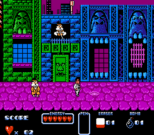 If there’s any film that Brad Pitt would like you to forget, it’s probably “Cool World.” And thrust it into the annals of forgetfulness we have! The same should go for this game on the NES, yet another in the system’s lineup that will induce bouts of haven’t-I-seen-this-before-itis, and wow-Ocean-can’t-make-a-good-game-to-save-their-life-alia. You play as a leaping mad Gabriel Byrne and you avoid fast cars, cheap women, gangster squirrels and good taste, all while fighting for your right to get onto Broadway or something. You are armed with a pen BECAUSE IT’S MIGHTIER THAN THE SWORD (should you be able to find it), an eraser, and a bomb. These are your weapons because, you know, you’re a cartoonist and cartoonists like to make things explode wherever they go. I don’t know, can one expect much sense from a game that features squirrels with fedoras and tommyguns? Cool World is going for the Who Framed Roger Rabbit? vibe, both in terms of the film and the game. Instead of being a straightforward crappy detective game with awful driving mechanics, Cool World expects you to solve puzzles the old-fashioned way: by not giving you a clue as to where to go or what to do. Much like Who Framed Roger Rabbit? by the infamous LJN, the formula works. Even after wandering around the Cool World Streets (actual level name) for awhile, and trying unsuccessfully to avoid getting pelted by squirrel droppings encased in bullet shells, I still lacked the slightest idea of where to go. Throw in Atari 5200 graphics and a brutal lack of self-esteem and you have Cool World. Because if you have to say you’re cool, it probably means that you’re not.