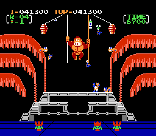 Few have played this particular entry in the original Donkey Kong series and it’s often seen as the black sheep of the original trilogy. Said haters should go and replay all three Kong entries back to back. Donkey Kong 3 is more of a button masher than the first two, but the replay value for it far exceeds Donkey Kong and Donkey Kong Jr. You play as Stanley the Bugman, in his first and only starring role, and your purpose is to push Donkey Kong back up his vines and off the screen where he belongs. Bugs will also come and attack you, and also try to take your flowers at the bottom of the screen. Your flowers will give you extra points once the level is done, so you want to protect them WITH YOUR LIFE. Hit the bugs and Donkey Kong with some bug juice to beat each level. It’s simple, fast-paced fun. Much like the first two, the levels repeat, but the arcade style of Donkey Kong 3 lends itself well to this. I definitely don’t mind replaying these levels as much as I did in the first two games. Different harder enemies emerge the further you get into the game. Your only real power-up is an add-on that turns your bug spray into mustard gas, and Donkey Kong and the bugs really hate that.