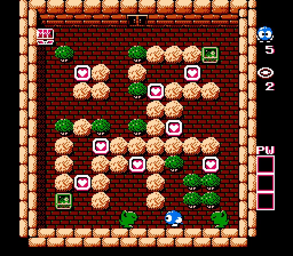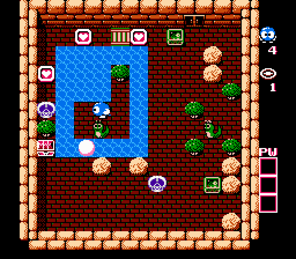 The enemies certainly lie at the heart of many of the puzzles. Some of the more common ones are medusas who will turn you to stone, unless you can cover their eyes (which can see you in all four directions); there are skulls who come to life and chase you after you acquire all the hearts; there are hopping lizard things that fall asleep the second they touch you, potentially obstructing your progress; pink dragons that wake up after you get all the hearts and shoot fireballs at you; and there are a few others too. King Egger does not want you to progress in any way. If you mess up in a stage, like trap yourself in a corner or accidentally use all your power-ups for the level, you can press Select, killing yourself and restarting the stage. It’s helpful, if a bit disturbing because Lolo screams like a slaughtered animal when he dies. Thankfully, the game has unlimited continues and pass words, should you get too frustrated. Often, the more difficult stages require some trial and error, which can result in many deaths for Lolo.