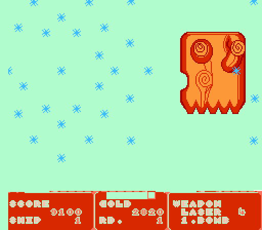 Consider me underwhelmed with this particular port, then. Screenshots of both the Master System and Arcade games look visually arresting, with surprisingly magnificent use of the pastel end of the color spectrum. Both backgrounds and enemies are unique and the gameplay itself is novel: despite most horizontal shooters limiting your directional curve to the right, Fantasy Zone allows you to turn around and fly back to the left. Sunsoft (the company behind the Famicom port) included this mechanic, presumably, because killing enemies generates coins which you can use to purchase better weapons and equipment. Enemies regenerate frequently, so if you really want to amass a bundle of coins, turning around is key. Inspired! While the Nintendo version retains the basic elements of the original Fantasy Zone, I’m surprised at how few enemies there are to shoot, at how bland the colors look, at how slow and pathetic your ship is without weapon and equipment upgrades, and (finally) at the unbalanced difficulty. Stages are too easy, while bosses can be quite difficult. My desire is to love all shmups, so admitting these realities to myself was depressing. Fantasy Zone isn’t unplayable, but it’s definitely an inferior port of what is probably an otherwise fantastic shmup.
