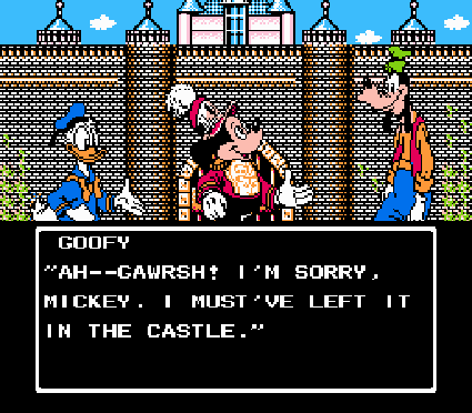 Capcom’s one of those companies that pretty much strikes gold every time with their games, even if what they’re putting out is the seventieth installment of Mega Man: Kroton Power XYZ. Their Disney games that they released on the Nintendo – Duck Tales, Tail Spin, Chip & Dale, etc. – are considered some of the more fun platformers for the NES, in that they aren’t cheap, they control well, and deaths aren’t necessarily around every corner. I’m not sure if Magic Kingdom was Capcom’s first attempt at a Disney game or what, but it is sub-par on the level of Street Fighter: The Movie: The Game (yes, two colons were necessary for that title); at least the latter has camp value.