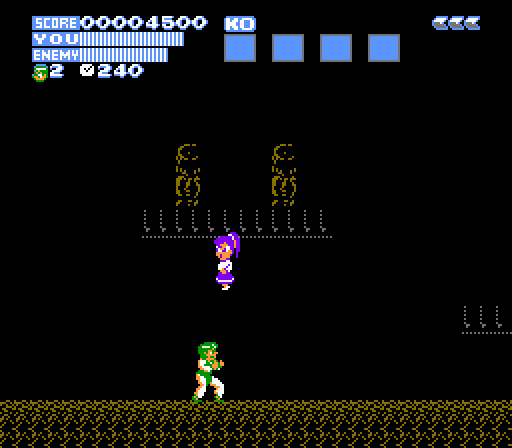 Flying Dragon is indeed split up into two sections. The brawler portion is little more than an enhanced Kung Fu, though not nearly as entertaining as Fist of the North Star. Interestingly enough, though, each level has about five “bosses,” enemies that drop key items each time you defeat them. Also like Kung Fu, the environments and enemies will repeat a lot. Each level’s backgrounds will repeat at least three times and the enemies NEVER STOP COMING. Keep jumping from platform to platform over their heads, so you don’t have to bother fighting them. It’s clear that Culture Brain’s heart wasn’t in this portion, however, as the tournament a.k.a. “early fighting game” portion is leagues more interesting. “Interesting” doesn’t necessarily translate to good, though. I admire how this portion of the game controls. You are required to defend your upper, middle, and lower body, while also trying to attack those same sections on your respective opponents. You’ll know when to defend and when to attack based on when these red bullseyes appear on either you or your opponent. It’s unique, to be sure, but the fights themselves just aren’t that fun. The NES pad, God bless it, just wasn’t made for fighting games. Unique, but clunky combat still basically translates to clunky combat. Later on, the game inundates you with fights and it quickly grows tedious.