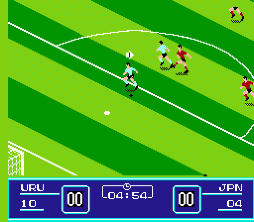 This time, instead of choosing from four countries for the World Cup, you can choose from about sixteen countries. Improvement! If you play a simple VS. Game, you have more options for countries, such is the game’s odd logic. Unlike in the first game, there are stats here, but I can’t read gibberish, so I didn’t change any of them and just went out and tried to play. Now, the gameplay… let’s stop here. Goal!, for all its flaws, was a simple arcade soccer game. I’m sure if you could figure out how to pass appropriately, it would have been a solid game. Goal! Two tries to go for bigger and better, but forgets that the NES, bless its dusty heart, can only handle so much. In addition to adding stats and other “big boy” options, the game’s soccer field is about two to three times larger than the one in the original. There was absolutely nothing wrong with the size of the original game’s soccer field. It was perfect! Also, the game’s AI is so hard, cheap, and blindingly fast compared to your team, that it’s nigh impossible to advance even to halfway across the field. Thankfully, your goalie has it going on and can block potential goals like he was protecting the mayor or something, but what’s the point of blocking if that’s all you’re going to do? Finally, as in the first game, you don’t actually kick to your teammates. You kick in their general direction. Not only that, your kicks seem like little wiener kid kicks: slow and useless. It’s a shame, as I was really looking forward to kicking out some soccer jams on the NES, but the Goal! series is not where you come to satisfy those particular jollies.