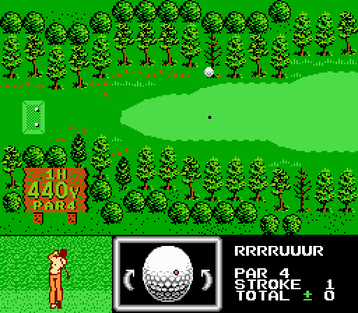 After that, you enter what I like to call the “God-help-you” portion of the game. A small screen comes up in your menu that shows an enlarged golf ball. Now within that golf ball, another tiny golf ball will appear and dart around like a frantic fly. Whenever you decide to press ‘A’, the tiny golf ball stops and whatever area of the larger golf ball it stops in, that’s the direction you will hit your ball. It’s ludicrous, and coming directly after the sim elements, feels a little cheesy. I don’t want to lie: most of the time you’ll hit a decent shot. But if you’re like most gamers, you’ll want to hit the best shot you can and that’s almost always impossible. Still, it’s a far cry from the diabolical WTF-ery of Golf‘s power meter. Most importantly, the game feels like a real game of golf… except not real because you’re holding an NES controller instead of a club while you play… and you’re probably not a middle-aged white guy with terrible fashion sense… and you definitely won’t win any money from playing and winning the tournament. But yeah, real enough.