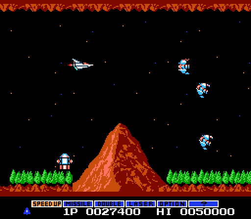 This game and Life Force are crazy good. How difficult are they? They make the Konami code a nuisance. You _want_ to suicide once you die because you can’t go on without the upgrades. Having to suicide 30 times in a row is too tedious to even bother with the code.