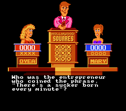 Hollywood Squares is even sillier than other game show video games. For starters, there are no celebrities in the squares; only faceless drones like Val, Daz, and other similarly titled vacuous names. Like the show, a question is asked, a “celebrity” answers (with random quips thrown out for good measure), and you either agree or disagree with the celebrity. If you’re right – regardless of whether the celebrity is right ot wrong – their square will light up with either ‘X’ or ‘O,’ depending on who you are. Yes, the entire game is essentially Tic Tac Toe, with egotistical ninnies acting as a go-between. Once you win three rounds (and the A.I. is quite stupid, so that shouldn’t be too big of a problem), you pick a key and a car and you hope the key unlocks the car. If it doesn’t, shucks, bad luck, you don’t get a car. But hey, at least you can play Hollywood Squares again, right? Right? It doesn’t matter if you win or lose. No really, it doesn’t matter. No fulfillment comes from either.