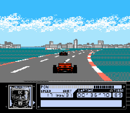 Turbo Racing is as close to a racing sim as you’re likely to get on the wee Nintendo. You have a couple different modes: Time Trial Mode A, Mode B, and World Grand Prix Championship Beyond Thunderdome. The latter is where you hope to spend most of your time, since it’s, you know, the game. But you will have to practice some in the Time Trial Modes because it’s near impossible to beat the times of your competition. Practice, practice, practice and then… you probably won’t win. The point of a racing sim is to make the races appear difficult, until you practice enough and a once unconquerable challenge becomes doable (see: Gran Turismo). Practicing with your car has to be fun and give you a sense of accomplishment. Turbo Racing stomps on your hopes of accomplishment.