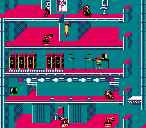 Your mission, should you choose to accept it, is to navigate a dim-witted gymnast through eight towers of destruction. For whatever reason, a maniacal man named Doctor Atombender (he bends them – who knew?) is determined to kill you and you alone. To do this, he employs robots, surveillance cameras, and an overall inflated sense of self-esteem (his towers aren’t that dangerous). Each room contains items you can search – paintings, safes, chairs – that will give you other items you use – bombs, mines, lights – to progress further up the towers. There is a general map you will be given, but it won’t explain much. This is a non-linear quest, old man, and you should treat it as such! Find what you need in each room and get out of there before time runs out. You have “eight hours” of Atombender time – which in real time, equals around one hour or so – to stop Atombender from… blowing you up? Yeah, sure, whatever.