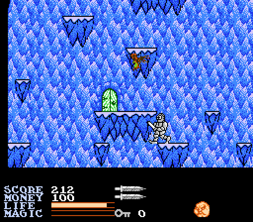 For better and for worse, Ironsword retains the Wizards & Warriors template. Kuros, the bug-eyed, Monty Python-esque knight in all Wizards & Warriors titles, lives or dies by his sword – a sword that may or may not be made of iron. It is not the Ironsword that you initially wield, though. In W&W II, the goal of the game is to reconstruct the Ironsword and defeat the Wizard in five thrown together stages. Find keys to open chests to gain treasure to further help your quest. There’s also a shopkeeper now where you can use your previously useless treasure in exchange for keys, food, and special items, among other things. Every stage forces you to ascend upward while Kuros fends off kamikaze enemies from every angle. The original Wizards & Warriors did this too, but here the enemies feel angrier, and Kuros still can’t swing a sword to save his life. C’mon, Rare, you had two years to fix this crappy mechanic! What you hope happens is that the enemies run into your sword as they’re attacking you. In other words: the only way you fight enemies is by not fighting them at all. Position your sword so that they run into it. The execution is poor, especially when you have several enemies from every direction coming at you. Even if you kill a couple, it’s nearly impossible not to get hit. Rare also took out the unlimited continues from the first game, though I’m not sure why; you need them just as much in Ironsword, if not more so. Sequels should be, in theory, an improvement over the original, or at least be on par with them. The sloppier sword mechanics and lack of continues really bring Ironsword down.