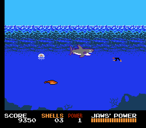 Jaws is not the only video game based on the “Jaws” book and movie series (hello Jaws Unleashed!), but it is the only game people think of, due to its overwhelming reputation for being a sucktacular crapfest. It’s simply not true. Jaws is a lot of things: boring, pointless, tedious, but it’s completely playable. Hear me out. In the game, as in the movie (as in the book), your entire goal is to rid the lovely beach side community of Jaws’ presence. He’s a menace, eating people left and right. However, despite your good intention, you’re just a lowly fisherman with some very poor weaponry. In order to “trick” out your harpoons to first-class baller status, you have to destroy other sea creatures to obtain shells, which you can then trade with merchants to upgrade your “stash.” While collecting shells (and starfish for bonus swag points), you must avoid Jaws. He’s pretty much out in the water all the time, being a shark and all. Fighting Jaws is relatively simple. Shoot repeatedly as he’s coming towards you, move out of his way to let him pass, then begin shooting him from the back. Once his lifebar has been depleted, take heart as there’s still one more fight to go. Instead of fighting in the water, you’re now standing on your boat and facing down the giant beast. Line up your boat with Jaws blood-stained teeth and fire a strobe, which will stun him. You then use your boat to stab Jaws. The end. The question now is, why should we expect a great amount of depth from a game that’s sole premise is killing one large creature? I’m thankful LJN had the decency to throw in the ability to upgrade your weapons. Otherwise the game would take five minutes to beat. Jaws isn’t a good game, but it’s not the travesty most people make it out to be.