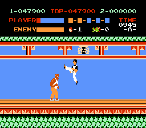 Kick, punch, it’s all in the mind. Or in Kung Fu‘s case, it’s all that you do. Kung Fu is one of the original NES launch titles, so don’t go into this expecting a wide array of technically impressive attacks. ‘A’ is punch, ‘B’ is kick, ‘Up’ is jump: be content with this and you will go far. Each stage sees you progressing either to the left or to the right, while piles of guys run at you, begging to be embraced by the lightning within you. Most guys you simply knock away with one hit, like so many abused punching balloons. Others, like the knife throwing guy and the short elven folk, require extra hits and a keen eye. To keep the game interesting, occasionally baubles filled with snakes will fall from the sky and dragons will appear, blow fire, then disappear. Each level has a boss whose difficulty ranges from “wait, that was it?” to “that bugger just took all my life with one hit!” The background graphics, music, and all-around gameplay are the same in every level, which is awesome if you’re a fan of repetition. I personally get sucked into Kung-Fu every time I play it, even though it’s incredibly dated and not that good of a game. For me, the speed at which the enemies advance towards you keep the game (mildly) interesting. I also have a score to settle: I have yet to make it past the large black guy at the end of the third level. There’s still two more levels! I want to save Sylvia from Mr. X! Even in ’85, Kung-Fu wasn’t Nintendo’s finest hour, but it was another solid addition to a surprisingly varied original lineup.