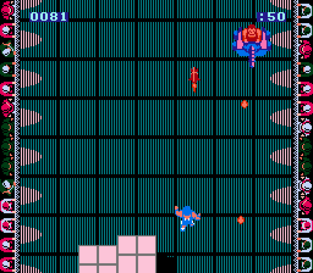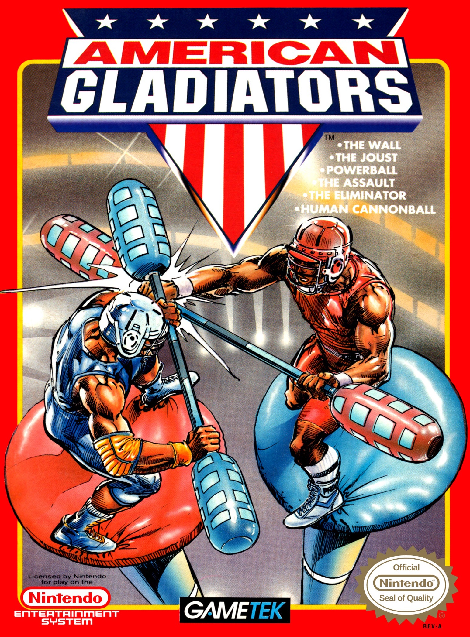 Five different events pummel you from the get-go: Joust, Wall, Human Cannonball, Powerball, and Assault. Joust is Urban Champion with ample hairspray, and jousting sticks. Each gladiator requires slightly different tactics to knock off their plush mushroom. Attack from up top, downtown, or in the groinal region. It matters not unless they fall! “Wall” should really be called “Wall Climb,” as that’s all you do. Alternate between ‘A’ and ‘B’ to ascend, but don’t touch any of the blocks or let the thigh-tastic women drag you down. Human Cannonball is my personal favorite. Jump onto a rope that’s swinging between two platforms and swang directly into your shielded opponent on the opposite end. Watching a goofy pixelated character fly off into oblivion is one of life’s simple pleasures. Powerball places you on an arena, with five open holes and a swarm of gladiator jerkbutts. Plug the holes with the balls that appear on either end of the arena, and gain an extra life. Don’t let any jerkbutt touch you with a ball in your hand or it will disappear before you can utter the ‘o’ in bro! Finally, Assault launches loads of projectiles at you, courtesy of an always-moving gladiator. Ascend up the course, avoid the projectiles, take him down with your own missiles if you want, and get out of there. After four rounds of these five events (with each round increasing in difficulty), you get to engage the mysterious Eliminator course. If you succeed, you’ll become the most American of them all. Fail, and they’ll mail your butt back to Russia.