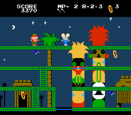 Mice running away from cats, collecting wedding rings and baseballs, jumping on trampolines (don’t let them turn red and break!) – these are but some of the quirky things happening in Mappy-Land. Mappy the Mouse (hey! That’s you!) runs through eight colorfully themed stages, collecting items and avoiding cats, birds, and other creatures that want a piece of your feisty mouse body. The cats are your main enemies and they are ruthless. The second they see you, they will come for you. Luckily, almost every stage layout is designed to have four floors, thus giving you some room to avoid the cats. To explain further, let’s say the cats are on the fourth floor, close to the top of the stage. Mappy is at the bottom floor. He is still able to see them, but he can collect his cheese, and go about his merry way, while the cats try to make their way down to him. Trampolines and ladders are how you and your enemies get from one floor to the next, but be careful on the tramps. The controls are a little sludgy to begin with, and on the tramps, it can be difficult to jump onto the right level. There are little weapons in each stage that you can use to get rid of or distract the cats, but they’re usually more trouble to acquire than they’re worth, especially on the earlier stages. Once you beat all eight stages and fulfill your girlfriend/wife/whatever Mapico’s desires, you start the stages all over again, this time with a new item to collect. The stages repeat three different times, though the layouts change slightly and become harder the more you progress (the cats, in particular, are faster than you by stage 3-1). Cumbersome controls and repeating stages aside, Mappy-Land is an enjoyable quickie, a ten-minute blast of pure pick-up-and-play arcade quirk.