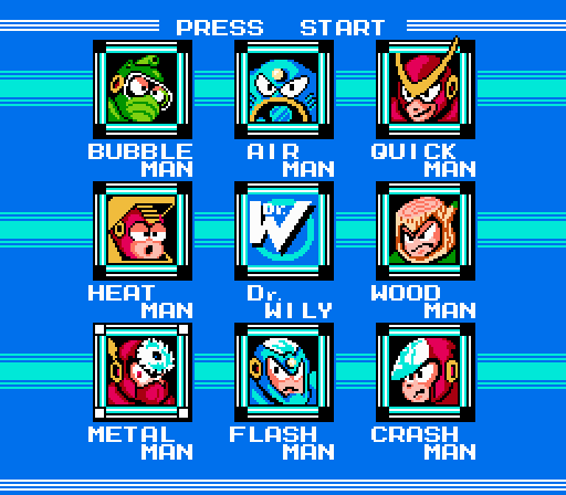 In Mega Man 2, eight Robot Masters await to bring about your demise: Metal Man, Flash Man, Quick Man, Wood Man, Air Man, Crash Man, Bubble Man, and Heat Man. The order in which I listed them is the particular order in which I beat them, but like the original, there’s no set standard. If you’re Mega enough, you could beat them in any particular order.