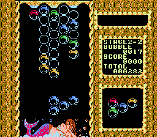 Who doesn’t remember Bubble Bath Babes, the extremely rare, unlicensed nudie puzzle game? My review for it is one of the most read on my site – which means readers are extremely curious about it or they’re hoping (in vain) to see some 8-bit body parts. Regardless of my readers’ intentions (I don’t judge, I’m just glad you’re here), Bubble Bath Babes was an interesting take on the puzzle genre. So much so, that Panesian decided to release the game again in the form of Mermaids of Atlantis. Yes, Mermaids in Atlantis is exactly the same game as Bubble Bath Babes, just sans nudity. Now you can play this upside-down combination of Tetris, Puyo Puyo, and Puzzle Bobble, relatively guilt-free!