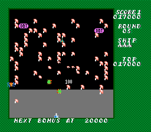 Millipede is one of those “before-my-time” romps that I’ve never been able to get into. You inhabit a young warrior seeking to destroy any and all bugs that roam in dark wastelands, particularly the multi-segmented nightmares known as Millipedes. Unfortunately, you’re given a very limited space in which to destroy them. Three quarters of the on-screen action take place in the dark, while your warriors space is gray and small. Mushrooms are scattered around by the dozens, and you’ll have to shoot through them in order to destroy the millipede and advance to the next level. For added fun, when you shoot the different segments of the millipede, they turn into mushrooms themselves. Sunrise, sunset, I suppose. In the meantime, spiders and other creepy crawlies emerge from the forest, begging for your weapon’s attention. There are DDT bombs you can shoot to blow up segments of the millipede, but since the millipede moves like greased lightning, it can be a gamble. The action is incredibly fast-paced, so much so that it’s impossible to catch your breath. After you destroy the millipede on one stage, the game changes the color palette and you’re suddenly on the next stage, shooting up another millipede. But most old games are about points, right? In that sense, Millipede succeeds as a quarter-robbing time-stealer. Just don’t go looking for any more than that.