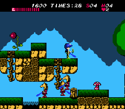 I’m going to go ahead and guess that, unless you, the reader, grew up with this game as a child, you’ve never played it and possibly have never heard of it. There is every reason for this. Before SNK found their niche with fighting games and top-down shooters, they tried a little of every genre, including side-scrolling. If a company is not used to making games within a certain genre, and their drive behind the game is “We’ve never done this before. Oh what the heck? Let’s give it a go,” do not expect good things. Athena was the result of this mentality. This goddess of wisdom, who seemed bad-ass in all those Greek tales, is, in this NES version, a flake. She acquires pieces of armor over time by searching through dirt clods with swords. Even if you get the best armor, the best weapon, the best everything (squat down on the first small mushroom you see in level 1-1 – you’re welcome), you run a risk of losing your armor the more you get hit. Fair enough in games that play fair, but the enemies that come at you here are extremely erratic and have no pattern. You can kill three horsemen/Jar-Jar Binks and five more will come rushing at you from across the screen to replace them. Sometimes they can jump, sometimes they can’t, so you really have no idea what the enemies can do until they do it. God help you if you want to jump over them. Unless you press the perfect combination of “Up” and “A,” your epic warrior jump will become a prissy little leap into the enemy. It’s moments like the latter that make you want to ram a fist into your NES machine, especially when pansy thrusts into the air make deaths so frequent and needless.