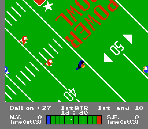 It’s probably wrong for a non-football fan to review a football game, but despite what my John Elway’s Quarterback review would have you believe, I do try and consider the audience for each game I play. Out of all the football games I’ve played for the NES (there have only been about three so far, and I haven’t played what many consider the best, Tecmo Super Bowl), NES Play Action Football feels the most comfortable to someone who knows little to nothing about the sport. The game doesn’t waste time with needless introductions or an overwhelming amount of options. I picked one-player vs. computer, my team (San Francisco), there was a coin toss (I lost), and the game was afoot. After the first play, the game gives you a couple options: you can play offense or defense, take a time out (only three per game), or substitute other players in if your mains (“mains”? sure, why not) are getting tired. Should you choose offense or defense, you get a choice of plays to perform. If you actually know about football, these plays are probably helpful, but I always just picked the one that sounded the best (man-to-man rush? What testosterone-driven dude doesn’t like the sound of that?!). This game was actually sponsored by the NFLPA, so you’ll recognize a lot of late-Eighties, early-Nineties players in there; even I, in my relative ignorance, recognized Joe Montana. Like most sports games, it’s probably best to just grab a couple compadres, kick back some suds, and have at it, especially since you have the option to pit two-on-two. The computer’s fine, but where’s the heart?