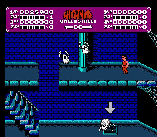 I’ve given decent scores to Dr. Jekyll and Mr. Hyde and Friday the 13th, despite the fact that neither of them are great games, and I was fully prepared to find the worth in Nightmare on Elm Street. Unfortunately, it’s another LJN-produced disaster, but let’s hold it right there. LJN takes a lot of crap, and sometimes deservedly so, but they did not develop Nightmare on Elm Street or the majority of their greasy rainbow-stamped games. LJN is only a publisher. Let that seep into your mind because many retro gamers (including myself in the past) have missed that point. Other companies developed all of those shoulda-been classics, like Back to the Future, Who Framed Roger Rabbit, and Alien 3, among so many others. Nightmare on Elm Street in particular was developed by Rare, of Donkey Kong Country fame. Given their pedigree, I would have expected a game of a higher caliber, but then again, it’s Nightmare on Elm Street, a licensed game based on a sometimes-good, sometimes-cruddy horror series. What do people actually expect from it?