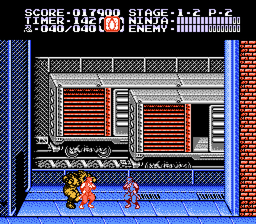 Irene’s missing. A new villain, Ashtar, rises out of Jaquio’s ashes. Robert, a mysterious ally, emerges from shadows. This is the genesis of The Dark Sword of Chaos. Whereas Ninja Gaiden I was a personal revenge tale, Ninja Gaiden II feels more like a summer blockbuster. The story brings back elements from the previous game, while adding more action and surprises. Ryu’s environments are more dynamic, as well. Stage 2-1 sticks you on a moving train, while stage 2-2 changes the direction of the wind and snow intermittently, forcing you to consider the timing of your jumps. Stage 3-1 is covered in darkness, until spurts of lightning show you your path. These little environmental flourishes enliven Ryu’s world, and bring a sense of urgency to his adventure.