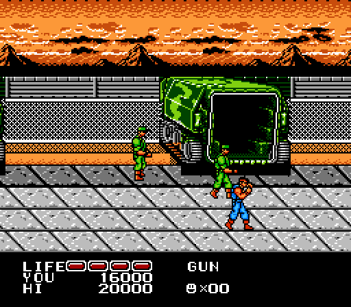 Prisoners of War is your standard 80s beat-em-up, chock full of one-man-against-every-terrorist-organization-itis, body count higher than the population of third-world countries, and a beyond thunderous soundtrack. After your escape from prison, you punch, kick, jump-kick, stab, shoot, blow up, and bad-ass your way to victory. Different variations of enemies include the Guys that Run Into Your Fists, Stabby McStabberson, the Knifing Gymnasts, Biker Jerks, and many more! You start out with four bars of life, but oh my, they reduce quickly. A couple punches can be brushed off easily, but one quick slash and your life is reduced by half and, like in real life, a grenade blast will kill you completely. In other words, be extra careful poking through this enemy base. Every person here wants your blood and you only have three lives to spare. Continues, sure, but these are long, grueling levels intended to waste ordinary men. Thankfully, you’re a prisoner of war, and getting captured was your plan all along, right? How else would you topple a fascist dictatorship if not from the inside, right? RIGHT?!