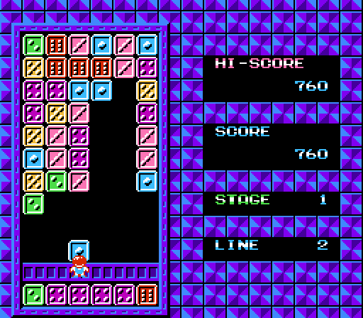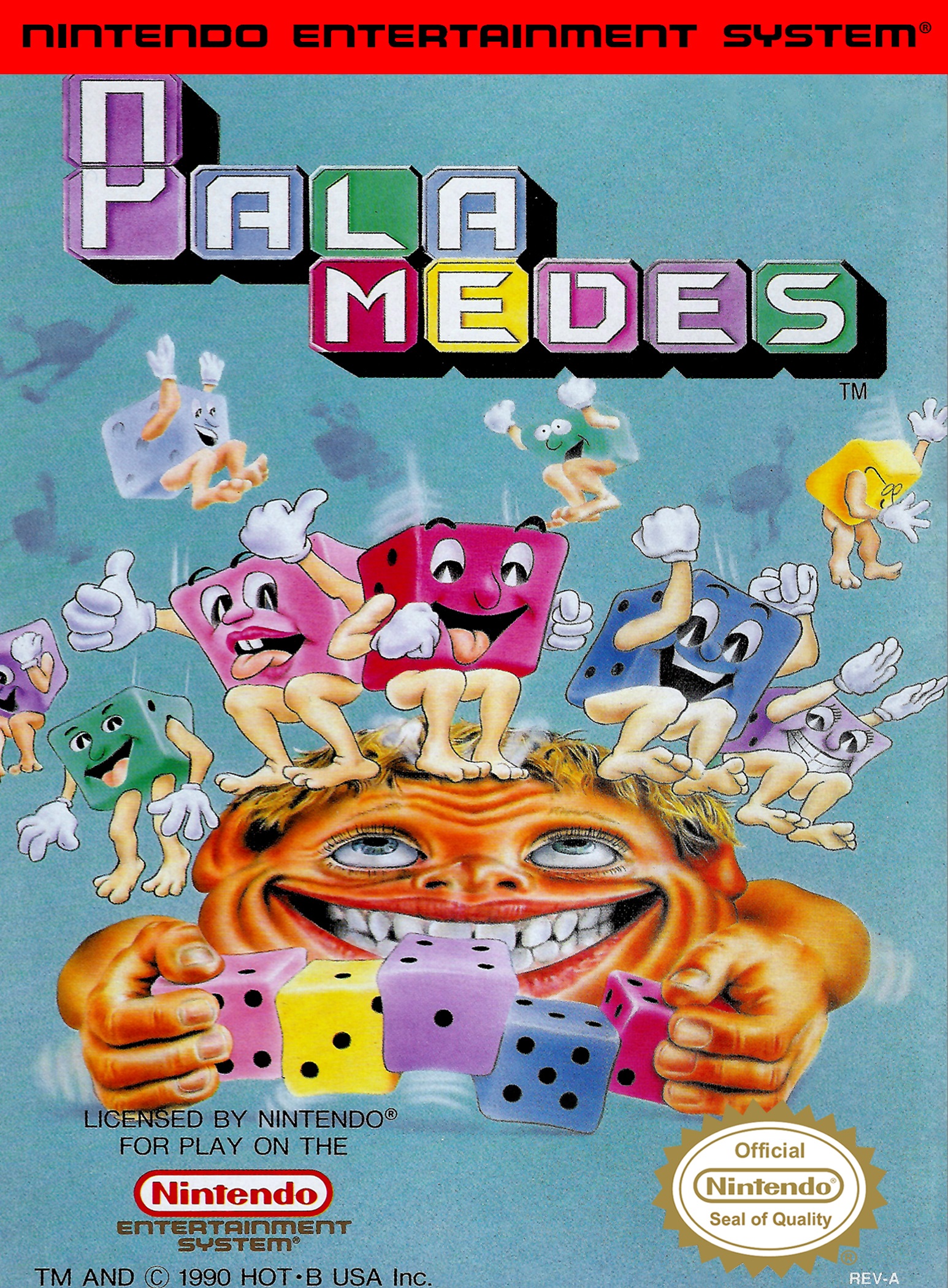 From what forgotten pit of gaming are these bizarre NES games emerging from? Palamedes?! You mean, the son of Nauplius from Greek mythology? One of King Arthur’s Knights of the Round? No, it’s a Japanese puzzle game with dice and a cute Astro Boy-look alike! Palamedes may be a forgotten relic of the ages, much like the mythological characters which bear the same name, but it can easily stand with the B-tier puzzle titles in the NES library: not quite Tetris-grade (what is?), but far better than that overrated diva Dr. Mario. Goals? We all have ’em and so does Palamedes. Rows of different-colored and numbered dice descend on Astrix Boy. Astrix Boy can throw like-numbered/colored dice at the row to make said dice disappear. A die typically only has six sides (unless you’re rockin’ a D&D match), and so it goes with Palamedes. You change the die number with ‘B’ and shoot it with ‘A,’ and unfortunately, you can only go forward with the die numbers, never backwards. This means if you meant to shoot a three at a three, and you accidentally go over to four, you have to circle all the way back around to three. The rows of dice come quickly and mercilessly. At first, it seems Palamedes will have the last laugh, but behold! There is more to this tale of myths and gambling! As you get rid of dice, they will appear on the bottom of your screen. Get more than three dice of the same number and color, press ‘Down’ on the D-pad, and obliterate a full line of dice. The more dice you get of the same number and color in your “reserve bar,” the more lines you’ll be able to destroy. This opens up the game and makes it the enjoyable experience it is. Two-player mode is available, as are five gradually more intense levels of play. Palamedes is waiting: will you heed the call?!