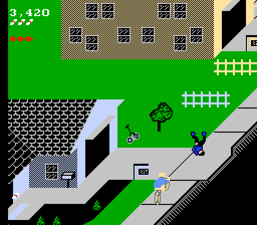 Should you succeed in delivering a paper to every house, you will be “rewarded” with a new subscriber, a former red house seeking to repent of its body-collecting ways. It will take a lot of paperboy skillz to keep all your customers and gain new ones, but if you lose them, don’t fret. You can still beat the game with only one customer (although your fellow paperboys won’t think much of you, I’m sure). There’s also a random training stage at the end where you can hone your paper chucking and bicycle control. Get to the end of the stage and three bored people will cheer you for your efforts! Make it through a road-rash filled week of nightmares and your name will be forever emblazoned at the Daily Star. Paperboy may not entertain as much as the Sunday comics, but it’s a solid arcade translation that doesn’t skimp on the insane.