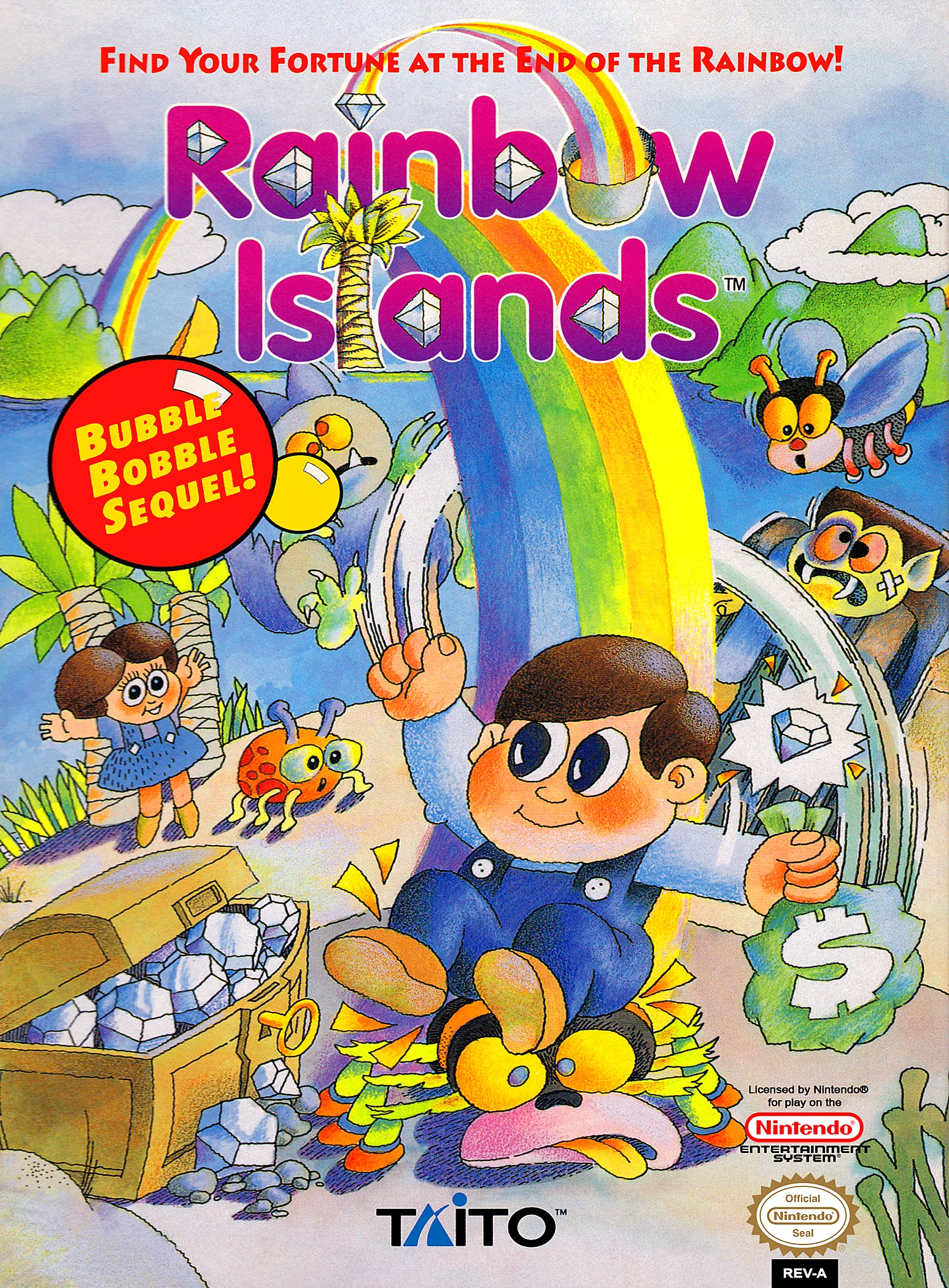 You don’t need a machine to make a rainbow. I learned this from Rainbow Islands. Bubby and Bobby, the game’s protagonists and former dinosaurs from Bubble Bobble, make rainbows appear with the power of their imagination. Best of all, they use them for everything. Need some stairs? Stack a few rainbows together! Enemies up in your grill? Drop ‘bows on ’em! The boss nagging you to finish that latest report? Tell him to shove off – with a rainbow! There are eight “islands” comprised of four stages each. Each stage has you moving upward and using your rainbow power to destroy enemies and collect treats. Collect every item you see, whether it be a tiara or a hot fudge sundae. Most of the items will just give you points, but some actually help you progress. Best items: stars destroy all enemies on screen, magic shoes make you move faster, and magic pots enable you to spit out two rainbows at once. If you trap an enemy under a rainbow and proceed to jump on it, the enemy will leave behind a diamond. Do this seven times per stage to spell out the word “RAINBOW.” After you defeat the boss of each island, he’ll drop a big diamond. Collect all seven of the big diamonds to unlock a special eighth stage. The stages don’t have a timer, but you’ll want to move quickly. If you dilly-dally with your rainbows, the stage will flood. And, as we all know, floods make rainbows disappear.