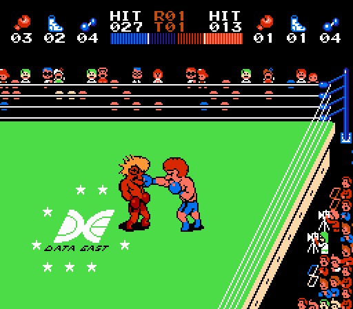 Not that either of them are anywhere near an accurate depiction of boxing, but I would argue that Ring King is much closer to the real sport than Punch-Out simply because you can move around the ring in all directions, there are clinches, and the call is honest and not rigged against you when the fight goes to points. (Because the game keeps a tally of clean punches landed on-screen at all times).
