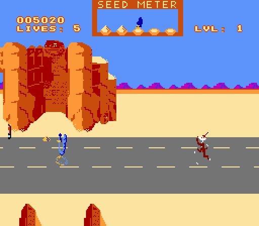 The Looney Tunes have strange lives, do they not? They act snarky, they get blown up, they dress in drag, they have speech impediments. In the case of Road Runner and Wile E. Coyote, they are chased and chase respectively, nothing more. Road Runner captures two of the most iconic Looney Tunes characters in their element – Wile E. pursues the Road Runner with a reckless regard for his own life, while the Road Runner, in theory, escapes the Coyote’s grasp every time – but there’s not enough content here for a full-fledged game. You play as the Road Runner with the objective to grab as much seed as you can, while avoiding Wile E.’s tactics. At the top of your screen, you have a seed meter with five seed piles. These seed piles are your speed. Miss five seed piles within the level and the seed meter will deplete completely, leaving you frozen, helpless, and at the Coyote’s mercy (or lack thereof). It’s best to keep Wile E. at a distance, but still visible on the screen. If you run too fast and he disappears, he’ll race forward on rocket shoes and you’ll have to pull some fancy footwork to avoid him. The first level is a five-lane highway, so weaving around him isn’t difficult, but later levels decrease the amount of space the Road Runner has to run, leaving him more vulnerable. Wile E. can also use a pogo stick to bounce towards Road Runner faster, or ride a rocket that will propel him back and forth across one area of the screen. Both tactics are obnoxious, but the rocket is easier to avoid. Collect bird seed to keep you moving, avoid Wile E. Coyote so you don’t die. Road Runner stays true to the essence of the cartoons on which it’s based, but there’s a reason the cartoons only last a few minutes. Any additional time and the viewers would grow weary of the shtick. So it is with Road Runner: perfect for five minutes, tiresome for anything over.