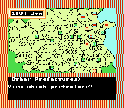 So here’s the historical lowdown: the game takes place in China during the Song dynasty. The Bandit Kings of Ancient China (if these kings really existed, I hope that’s what they called themselves because that is completely BA), are going to war against Gao Qiu, an evil Chinese dictator. From what I understand, you play as a lowly maggot and have the ability to acquire the Bandit Kings in your party as you progress, along with other random travelers or merchants or what-have-you. Any hardcore BKoAC fans feel free to correct me on this. It’s strategy on the NES, so battles are fought slowly and with little to no animation, but the point is to take over as much of China as possible before Jan 1127. If you haven’t taken out Gao’s entire army before then, the game is over.