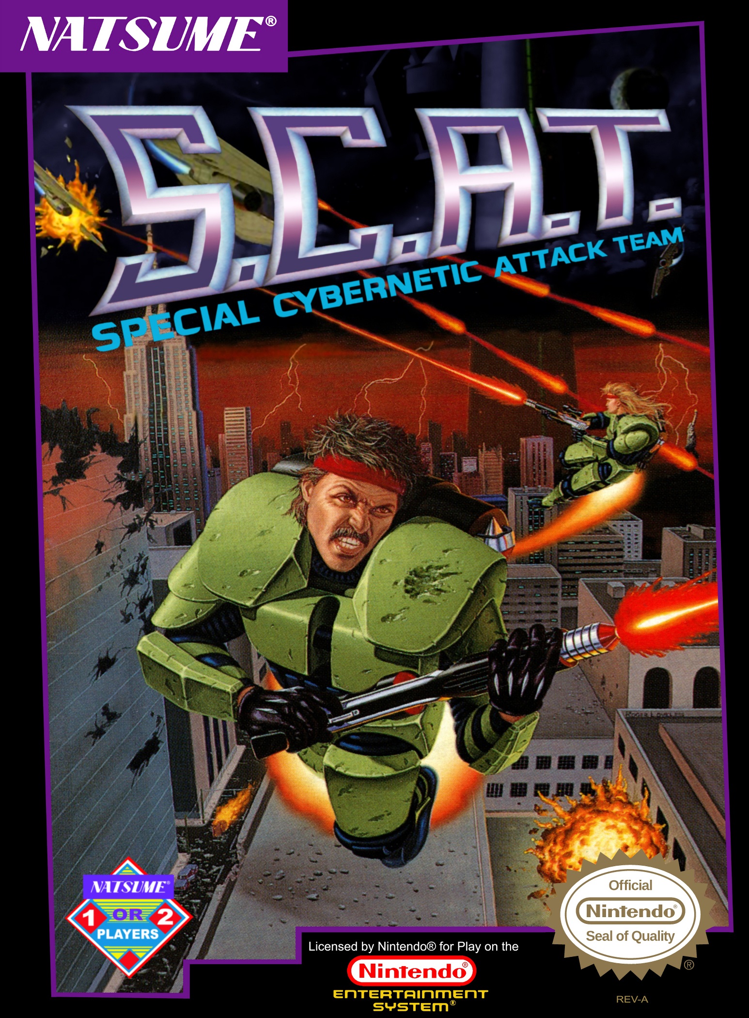 The future! If videogames are to be believed, the future is scary and metallic, filled with Robot Dictators and dystopian societies. And yet, thankfully, there’s always one man (or woman) who can redeem us from our cold, heartless overlords. In S.C.A.T., there are actually two, but both perform the same function: to attack special cybernetics; if there are two players, these special cybernetic attackers will “team” up, thus resolving the acronym.