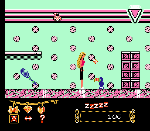 Seeing as I’m not the demographic Imagineering Games was going for, I will not be criticizing the excruciating and over-the-top girliness of the game’s design. Instead I will judge this game solely as one of hundreds of games released for the NES in its lifetime. That being written, Barbie is an incredibly easy and bland game that was only designed to capitalize on the overwhelming popularity of the “Barbie” franchise. It was one of the few games solely marketed towards girls during the NES lifetime, and it, much like the doll herself, treats little girls as if they were already vapid airheads. The plot? Hahaha. You control Barbie in her dreams about adventuring in the mall, at the beach, and at a soda shop. Eventually, you meet Ken at a party and dance the night away. It’s your typical NES left-to-right platformer, save for one interesting mechanic: Barbie can throw a crystal that allows animals in the level to help her. These animals sometimes take down enemies or even help you defeat certain bosses. It might not seem creative today in 2011, but I can’t recall an NES game that had a feature like that.