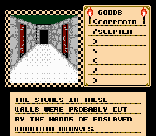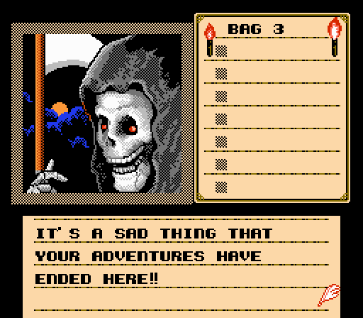 The goal is to explore the castle, collect any and all items you see, and take down the Warlock Lord before he raises the Behemoth. You have a number of standard adventure game actions, like Look, Use, Hit, Move, etc. Despite the lack of a mouse, navigating between the functions isn’t difficult. Every time you enter a room, take a hard look around. If you don’t find many items to collect, chances are, that room has a secret wall or a hidden item. Shadowgate eases you into its lair with baby steps, but frustration will abound as you get further into the game. Many of the puzzles are beyond obtuse (paging Nintendo Power! We need your help!). One of many examples: in the second half of the castle, there’s a room where you have to burn a rug with your torch to find a key, but there’s no indication upon entering the room that burning the rug needs to be your course of action… unless you Look at the rug (using the Look action). But why would you, it’s a rug? Your excuses don’t matter to Castle Shadowgate. For the love of your God (Shadowgate in-joke), Look at everything. Also, monsters almost always need a special item to be taken down. This isn’t an RPG in the slightest. Every kill, every step forward demands you to think outside the box. Use what you take. Experiment with everything. And always keep your two torches lit (torches are plentiful throughout the castle). Once your torches are snuffed, your life is soon to follow. Oh, and there’s no save function, so hunker down into your butt-groove and get ready for a long, arduous trek.