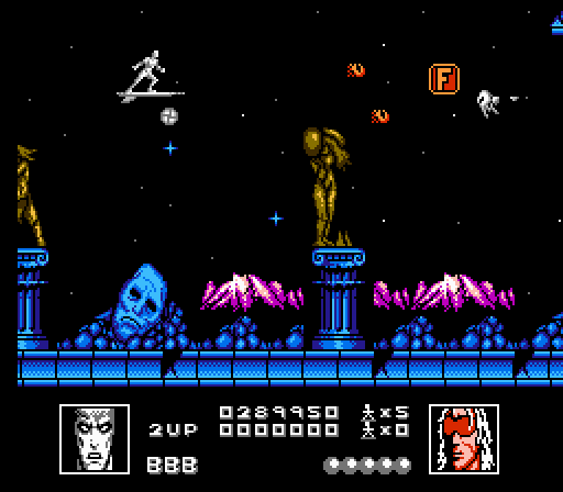 @ FieryReign: how many ‘C’-rated shmups are there on the NES? Quite a few. Sometimes a game’s only possible legacy is that of being notorious for something, and difficulty isn’t the worst credential (although “unfair” possibly is). That’s why citing AVG Nerd’s review of Silver Surfer is in context. Although it doesn’t take much to get his goose, Nerd has the ability to pull a game like Silver Surfer out of complete obscurity into the ranks of at least being remembered for something.