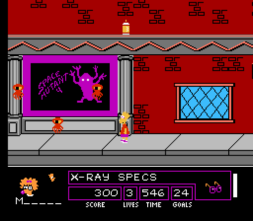 The controls in Space Mutants are a train wreck. Bart is slippery, and while he does have high jumps, it’s often hard to control him in the air. Because he’s unwieldy, simple tasks like jumping up onto a windowsill becomes a Herculean effort (throw some enemies into the mix and you’ll be weeping in your beard). Shuffling through your item menu with ‘Select’ isn’t an issue, but why do you have to use the item with ‘Start’? ‘Start’ is always the ‘Pause’ button, no exceptions (to pause Space Mutants, scroll through your items until you find Pause, then hit Start – ugh).