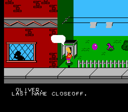 The premise is explained well enough in the title: Bart has to versus some space mutants, who are slowly taking over Springfield. In each of the five levels, Bart has to accomplish a random task, like removing all of the purple objects, collecting hats, popping balloons etc. Apparently, these items will aid the Space Mutants in their quest for… Springfield domination? For one of the smartest (at the time) shows on television, the plot is beyond lazy. The path to execute your objectives is often unclear or trial-and-error based. For example, in the first level, there are several purple flowerpots on window sills. Bart is trying to extinguish the color purple with his trusty red-colored spray can. Get up on the window sills, spray the flower pots, right? One would think, but in fact, you have to spray them from a certain angle. If you don’t spray them just right, you waste your limited spray and you’re screwed. At one point, you’re supposed to spray a policeman dressed in purple, but he walks quickly across the screen, and once he’s gone, he’s gone. It doesn’t matter if you die or walk away from the area to try and make him re-appear. You have to lose all your lives and start the game completely over to make that policeman saunter towards Bart again.