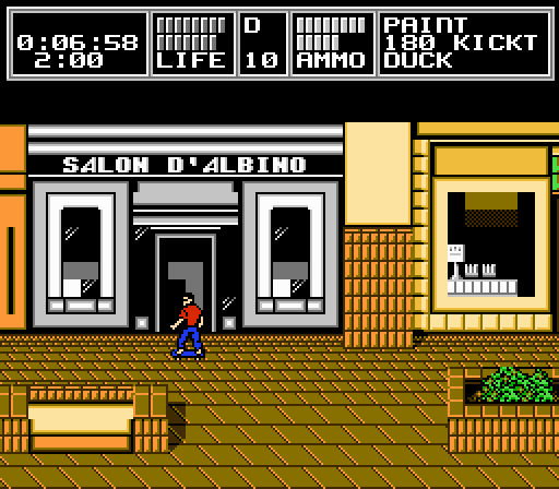 The control scheme, in theory, should work well, but the execution is lacking. To skate, you tap left or right on the D-pad to give you momentum. If you want to turn and go the opposite direction, however, you can’t just tap left or right and flip around instantly. You brake first by pressing the D-pad in the opposite direction, then turn around and start skating. This becomes an issue in almost every level because braking is never as quick as you want it to be. If you’re trying to find Rodney, the shopkeeper, and he skates by you, there’s no way you’ll be able to turn around in time to catch up with him. Pressing ‘A’ is jump, like any good NES game, but ‘B’ is a hot mess. On the menu screen, you can program three different functions into the letter ‘B,’ such as, your weapons or various skate tricks. In order to use these things, you can’t just hit ‘B.’ Depending on what slot you have assigned your weaponry or tricks, you have to hit Up, Right or Down on the D-pad plus ‘B’ in order to use them. It’s overly cumbersome, and in the last couple levels especially, hinders your progress.