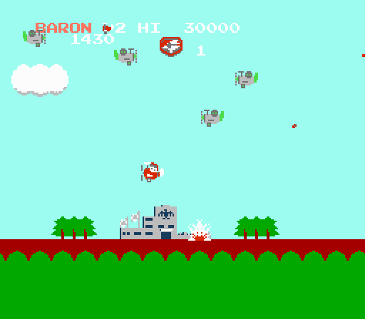 Put some grease in your garter, Sky Kid! Or is it, Red Baron? My papers say two things… well, it doesn’t matter! I don’t give a lick who you are, just make sure your garter’s all greased up before you go flying out into the wild blue. Rival fighter pilots and freight trucks will combine their likely Communist powers in order to take you down, Sky Baron. You can shoot ’em or, when the goin’ gets rough (and it will – twelve missions of patience-testing ahead of ya, if ever I’s a day), do a whirlybird in the air to avoid incoming fire. Your main target in each of the twelve missions is the gray steely base known as The Main Target. In each mission, there will be a bomb somewhere that you can attach to your underside; just fly over it and it’ll grip to ya. Drop the bomb in the middle of the main target, and be on your way. If you drop it too soon or too late, the compound will remain intact and we’ll dock your “points” (in other words, your paycheck Red Kid, read between the lines). Remember! If you start to spin out of control, hold the directional pad upwards, then hit ‘A’ and ‘B’ on the control panel rapidly until you right yourself. This will save your life numerous times, I can’t stress that enough. Now, they say you’re the best, and that might be true, but even the best of us need some help. If need be, we can send in Max, who I’ve nicknamed “The Blue Baron” in honor of you (unlike you, he’s simply named Max – we can’t all have five names, Kid Baron). Why are you still reading this? Get your helmet on, comb your mustache, and soar to the heavens. Don’t make me shove more grease in your garter!