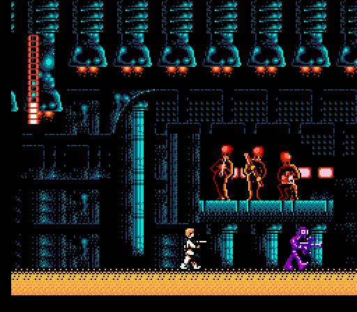 If I were the Retro Gaming Judge, sentencing grumpy edicts from on high, I’d hold Star Wars in permanent contempt for besmirching the mostly reputable (in 1991, anyway) sci-fi franchise. Its crimes are numerous and belligerent: 1) Short cave exploration sequences, complete with creatures who attack you while you’re jumping, wide gaps that are easy to fall through, and generic level design. 2) Luke’s initial blaster weapon is, and I quote from the court records, “piss-poor.” It takes several hits to kill any enemy, ranging from a rat to Greedo. Some enemies seemingly can not be killed at all, no matter how long you pump them “full of red.” 3) If you are shot by an enemy, your standard length life-bar will decrease by four points. If you touch an enemy, your life goes down by half. 4) Once you acquire Han Solo into your party, you can never let him die. Otherwise, you’ll have to travel back to the cantina and wade through a mess of Greedos and bizarre cantina remix music (that sounds suspiciously like Mega Man) just to pick him up again. 5) If you touch Boba Fett or his clones, he becomes a spewing mess of bullets, much like any shmup end-boss. I’m not sure there’s any way to kill him. After many deaths, I stopped caring. Leia, the Death Star, and I’d imagine, unprecedented amounts of rage await players who soldier forth through Star Wars. Much like “Attack of the Clones,” the Star Wars Christmas Special, and Jar Jar Binks, it’s not worth it.