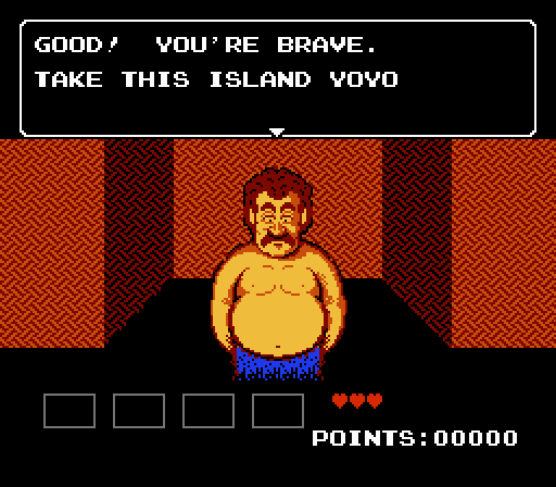 StarTropics starts off as an all-American take on the original Legend of Zelda before blossoming into its own brand of adventure funk. You are Mike Jones, a “teenage star pitcher” who wields a yo-yo. Explore and conquer dozens of island caves, while searching for your archaeologist uncle, Dr. Jones (also known as Doctah Jones!). Indeed, the story of StarTropics couldn’t be less riveting. None of the islanders are funny or interesting, and Mike as a character is as boring as apple pie sans ice cream. It’s the dungeon exploration that keeps the game alive. Like Zelda, you can only deal with one room of each dungeon at a time. You have to kill every enemy in the room or step on specific green blocks to open up the path to the next room. These green blocks are crucial to the game. While you can jump on any of the blocks, only certain ones will reveal hidden necessary items or secret doors. It sounds strange to say, particularly if you’ve never played StarTropics, but jumping from block to block to unlock secrets is incredibly fun, and a key to the game’s success.